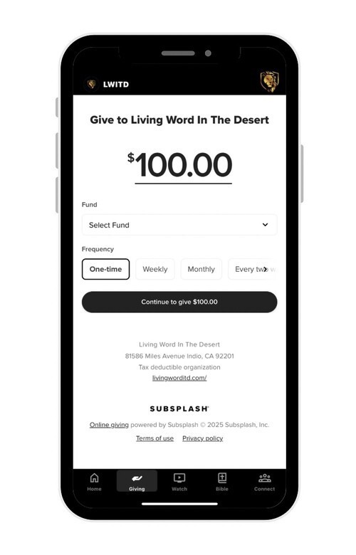 With the Living Word in the Desert app, you can give securely, set up recurring gifts, and even use Apple Pay—all in just a few taps.