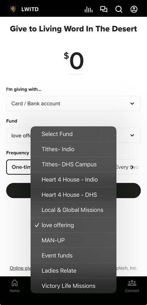 You can give in person during any of our services on Sunday or midweek by using the Living Word in the Desert app, cash, or check. During the service, buckets will be passed where you can place your gift in a Giving Envelope.